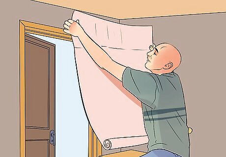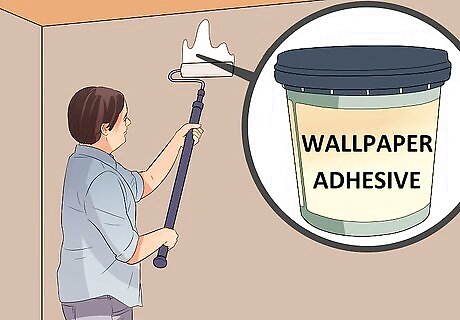 Add your adhesive to the top. Using a paint roller, apply adhesive to the back of the wallpaper. The idea is to wet the paper, not drench it. It will take a few attempts to get a good feel for the right amount. Make sure you roll past the edges to get adhesive at the seams. Only apply your adhesive to the top half of the paper for now. This step may be skipped for wallpaper that is pre-pasted.