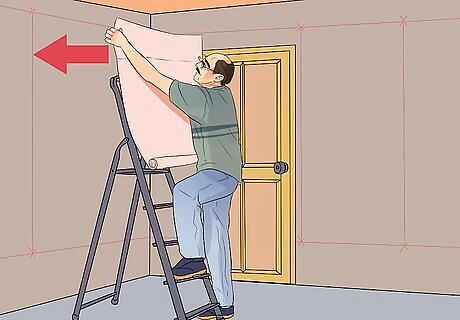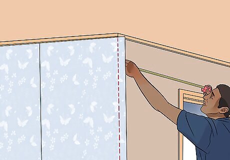 Make your measurements. Measure your first piece from ceiling to floor. Typically, in a house with 8 feet (2.4 m) ceilings, your measurement will be about 92 inches (233.7 cm) since most everyone will have a base board at the floor. Roll out your wall covering on a table or floor, pattern side up. Double-check all your measurements so that you don't make a mistake in cutting your paper. The goal is to keep your paper in as big of sections as you can to create a more seamless look.