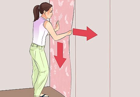 Stick the bottom half of the strip. Now you should have the top 36 inches (91.4 cm) of wallpaper applied to the wall with the rest of the paper still folded up. Carefully find the bottom edge of the paper, lift away from the wall slightly so the paper you are pulling down will not stick to the wall and gently pull it down the wall until it is completely unfolded. You may undo an inch or two of the initial work above but that’s no big deal. Starting at the top right of this section, use your 24 inch (61.0 cm) level as a guide to stay plumb at the right edge and smooth out the rest of the paper starting from right to left. Don’t force the paper over to the corner, let gravity help place the paper onto the wall.