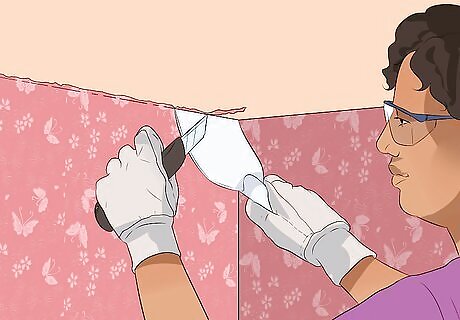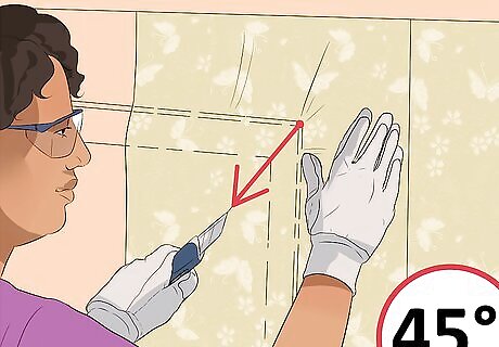 Work around the window. Continue adding strips of wallpaper around the window, making sure to keep a plumb line so that your strips are perfectly vertical. At the areas that hit the window, cut downwards at a 45 degree angle and then around the inside of the frame. You should eventually get to a point at which your window or door has a rough cutout of wallpaper around it.
