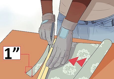 Cut your wallpaper. On the table, cut your wall covering about 1 inch (2.5 cm) above your designated “top” ensuring you do not cut a crooked line or wavy line that extends down into the pattern where your “top” is. This will give you excess while hanging and this will be trimmed away on the wall. Take a razor blade and cut the roll about 1 or 2 inches (2.5 or 5.1 cm) beyond the total length measurement. This excess will be cut off on the wall. There is a little more leeway with the bottom excess. When in doubt, add a bit more to the bottom than to the top. Use a yardstick to help make your cuts smooth and even, and to prevent cutting at an angle.