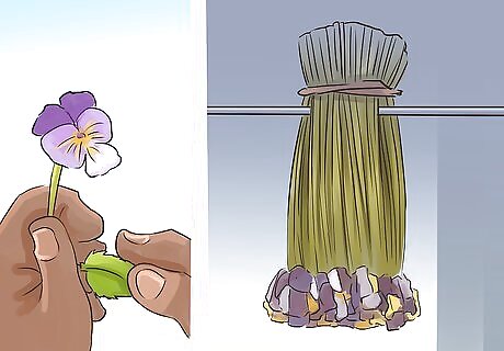 Dry heartsease. Pick heartsease flowers and remove the leaves from the stems. Bundle flowers together and hang them upside down in a warm, dry, dark area (e.g. an attic). Leave them there for two to three weeks to dry completely. To make tea, which is often brewed and consumed for heartsease’s medicinal properties (e.g. as an expectorant or diuretic), dry heartsease flowers for immediate use or storage.
