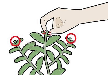 Pinch off buds to extend your harvest time out further. Each time you check your plants through the main growing season (summer), look for buds at the tips of this flowering plant and pinch them off with the nails of your index finger and thumb before they can bloom. While this prevents flavor being diverted from the leaves, it also stops your plants becoming 'leggy', so they end up bushier with more leaves to harvest.