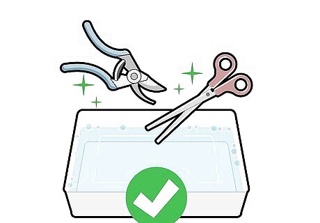 Prepare your scissors or pruning shears. Whenever pruning any plant in your garden, first ensure the blades of your scissors or shears are sterile enough to prevent spreading diseases. Wipe the blades regularly with a little alcohol. Alternatively, wash them with soap or disinfectant and hot water. You can also soak them in water mixed with a cap-full of bleach before use.