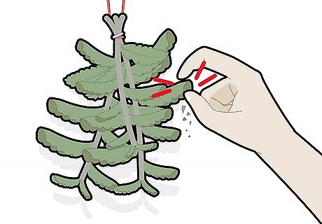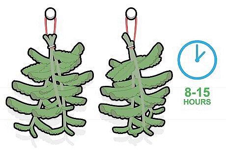 Hang your bundled stems upside-down. Choose a warm, well-ventilated area for this. Ventilation is more important for drying than heat. Leave the bundles hanging for 8 to 15 hours. The drying time will differ depending on the level of humidity in the air. If you don't want to bundle and hang your stems, lay them flat on a rack, net, absorbent paper towels or a dishcloth. Hang or lay out your harvested stems in the sun for a faster drying time.