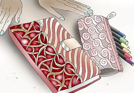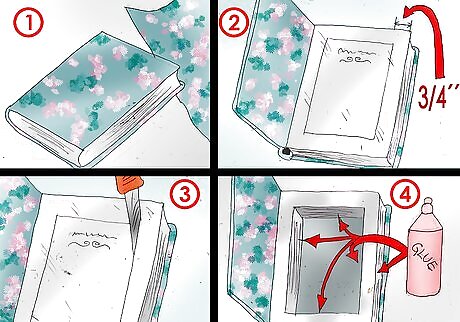 Make a book-safe. Cover a thick, hardcover book with fabric that matches your style, or buy an extra copy of your favorite book. Hollow out the inside and glue the pages and back cover together. Use it to store your pens, pencils, and other supplies! Open the book to the very first page. Use a ruler to outline your inner compartment. Leave 3/4 of an inch or more between the edge of your compartment and the edge of the page. Slip a piece of cardboard between the last page and the back cover to protect the back cover. Use a utility knife to slice through the pages along your outline. For straighter edges, use your ruler as a guide for your blade. If you want to, use scissors or sandpaper to smooth any rough edges left over from slicing. Brush a light amount of glue over the outside of the pages, the insides of the hole, and where the last page touches the back cover. When you’re finished, slip some wax paper between the very first page and the front cover so they don’t stick together. Then stack other books or anything else that’s heavy on top of the closed book so all the pages remain flat as they dry. Repeat the gluing process. The glue’s moisture may cause the pages to wrinkle, so it’s best to apply a few coats with a little amount each time, rather than slather the whole thing at once. Wait for each coat to dry before applying more glue.