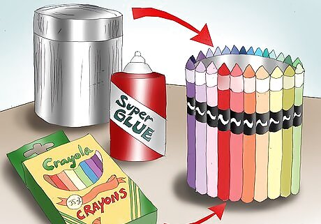 Make a pencil holder out of crayons. Remove the label from an empty 6 oz. metal food can. Clean, rinse, and dry the can. Break out a 24-count box of new crayons. Apply glue along the length of each crayon and press it lengthwise to the can. Depending on how fast your glue dries, wait for each crayon to seal securely to the can before gluing the next one on in order to avoid dislodging any. Use colored or customized pencils for larger cans.