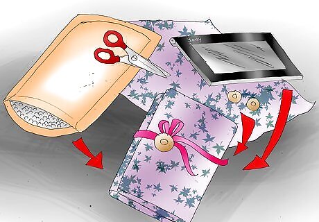 Make your own case(s) for your tablet. Buy a bubble-lined mailer that will fit your device when you slide it in horizontally. Find fabric that matches your overall style. Or buy a bunch of mailers and several different fabrics so you can create cases to match each outfit! Set the mailer on a surface with the shorter side (the one without the extra tab for sealing) facing up. Insert your device all the way into the mailer, width-wise. On the side facing up, trace a line along the outside of the mailer a little above the top of your device. Remove your device. From the top down, cut along the seams on either side of the mailer with scissors until you reach your outline. Then cut along your outline to remove this piece from the front of the mailer (be sure to only cut the front and not the back!). Now fold the back of the mailer over the front to form a flap for your case. If you’re happy with its size, leave it. If you’d like the flap to be shorter, trim the desired length off. Spread out your fabric(s). Use your mailer to outline and cut out three pieces: one to line the inside of the case, one to cover both the front and back of body, and another to cover the inside and outside of your flap. Each piece will cover two layers, so remember to double your measurements when using the mailer as an outline. Glue, staple, or sew each piece of fabric to the mailer. Start with the lining for the inside of the case. Then do the case’s body. Finish with the flap. Choose two buttons that match your fabric(s). Close the flap over the body of the case and make a mark on each to place your buttons. Cut a length of ribbon, string, yarn, or similar material and knot one end around one button. Use the other end to wrap around the other button and keep your case closed.