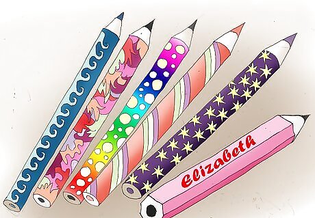 Customize pencils. Either buy pencils that are already painted in bold colors, or spray-paint them yourself (be sure to wrap the erasers with tape first, as well as the sharpened ends if your pencils aren’t brand-new). Once the paint is dry, tape both ends to a hard surface to keep them in place. Next, gather lettered metal stamps to spell out your name or even a short phrase. Press the first stamp’s lettered end into a colored ink pad. Then gently hammer the lettered end into the pencil’s side. Repeat with each letter and then let the ink dry once you finish.