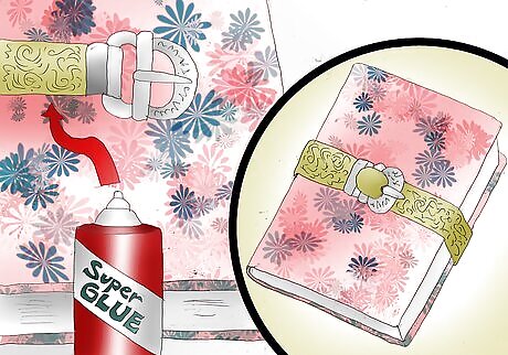 Make your notebook belted. Match a belt with a hardcover notebook or sketchbook. Center the buckle-end of the belt (not the buckle itself) on the front cover, with the buckle pointing away from the spine. Super-glue the belt’s buckle-end in place. For extra support, gently hammer an upholstery tack through the belt, about midway between the buckle end and the spine. Turn the book over and glue the belt along the back cover. Turn the book over again, lace the remaining length of belt through the buckle, and poke a hole through the belt for the buckle’s tongue. Only use glue on the covers, not the spine. Gluing the belt to the spine would make opening the book again much more difficult. Soft-cover notebooks may be more prone to tearing.
