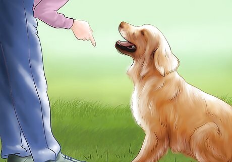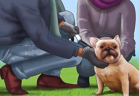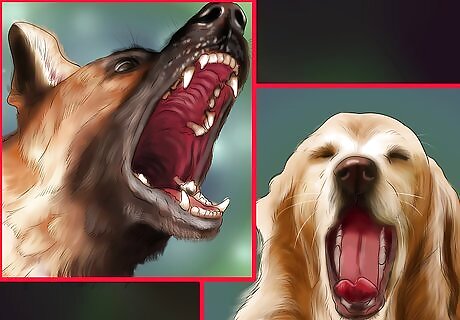 Recognize signs of distress. Many dogs exhibit signs of distress when they're feeling fear or anxiety. A dog may show distress by barking or biting at the air, but other signs of distress may be less obvious. Other signs of discomfort may include yawning, licking their nose, crouching, walking backwards, or making the body as small as possible. If you notice signs of discomfort with your dog, try to identify the source of the discomfort. This will help you better understand your dog's reaction and help better prepare yourself and your pet in the future. Do not try to force physical attention on your dog if they give indicators that they do not want it, such as backing away. Forcing attention could startle them more and cause an unintentional aggressive reaction.