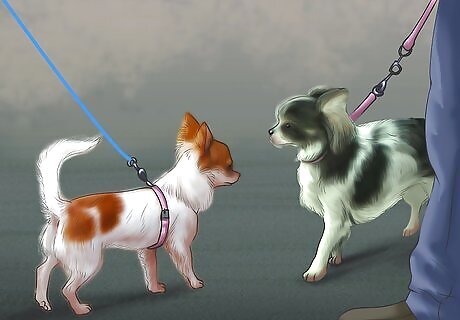 Bring them around other dogs. Socializing an emotionally fragile dog allows them to work out their fears and frustrations with their peers. Take your dog to the dog park, set up one-on-one play dates, or have them walk alongside another dog during their daily walks. It's important that these are positive experiences for your dog. Otherwise, they could make its anxiety worse. Start out slow if necessary so you don't overwhelm your dog. Remember to reward your dog whenever it remains calm. If your dog displays any aggressive behavior toward other pets or people, it may be necessary to work with a trainer or behavioral specialist before you continue socializing. When you walk past another dog, let the two socialize for about 3 seconds before moving on to get your dog used to the interaction.