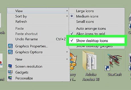 Click Show desktop icons. This removes the check mark and hides all icons on the desktop. To restore your icons, click Show desktop icons again to bring back the check mark.