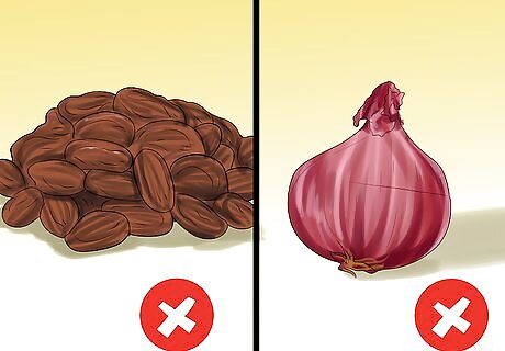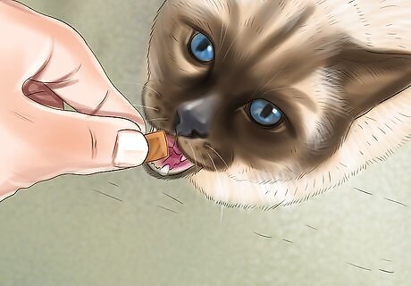 Avoid giving your cat human food as a treat. Cats can find it difficult to digest human food. Try to give your cat human food as an occasional treat, such as small pieces of cheese, cooked tuna, chicken, fish, or liver. Do not give them too much human food at once, only small bites or pieces at a time. Avoid giving your cat human foods that are toxic or harmful to cats, such as raisins, grapes, onions, alcohol, salt, tea, and whole milk.