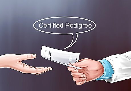 Get a pedigree from a reputable breeder. Reputable breeders selling purebred dogs should be able to show you a pedigree, a document that records four or more generations in the dog's family line, possibly including physical features and awards. A good breeder should know the pedigree of the dog by heart and be willing to show it to you upon demand. Pedigree certificates are official documents endorsed by the AKC. Check the certificate to make sure it is authentic. You can ask a vet familiar with pedigrees to look over the document. To find a reputable breeder, ask a veterinarian that you trust for recommendations. A reputable breeder should allow you to visit to see where their dogs are raised. The dogs should have adequate space and the area should be clean. Reputable breeders should specialize in one or two breeds and might be involved in clubs dedicated to the breeds or have won awards associated with them. They will probably not be able to provide dogs on demand; you will need to sign up for a wait list.