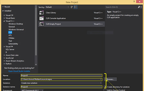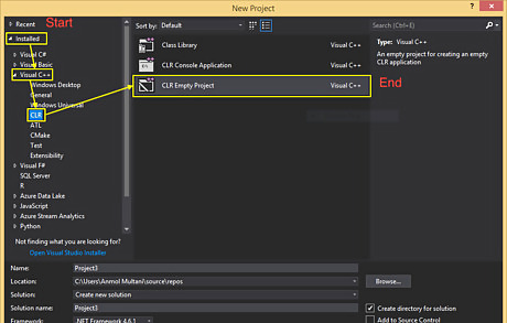 Create a new project. You must create a new project to group all the code that is associated with the specific goal you are trying to achieve. This helps with organization as sometimes the specific goal you are trying to achieve may require a substantial amount of code. In Visual Studio, use the keyboard shortcut Ctrl+⇧ Shift+N to open a new project.. In the rare case your Project does not open to a CLR Project (Clear Project), create a new C++ CLR Project by clicking on: Installed (Side Panel) Visual C++ (Side Panel) CLR (Side Panel) CLR Empty Project (Center view)