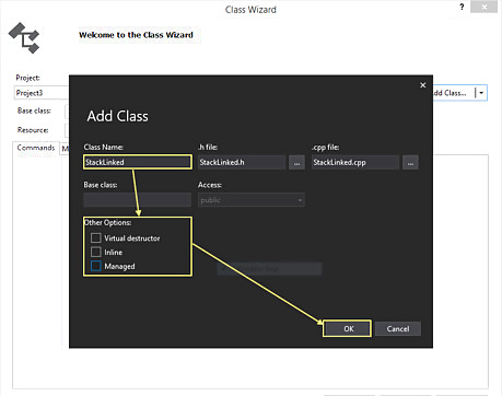 Enter the details for your class. In the Add Class window, enter StackLinked in the text box titled Class Name. Assure that none of the option boxes towards the bottom are checked. Once this is completed, click the OK button towards the bottom right.
