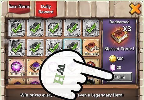 Log in every day to claim the daily reward. In some days of the calendar, blessed tomes are rewarded, which can only be rewarded through the daily rewards. The collection of these tomes include Blessed Tome 1 (100,000 EXP granted), Blessed Tome 2 (500,000 EXP granted), and Blessed Tome 3 (2,000,000 EXP granted). Even though these may seem like a lot, as said before, your heroes will require a lot more than this much. Save up tomes like these and use them only when actually needed, as they come in short supply.