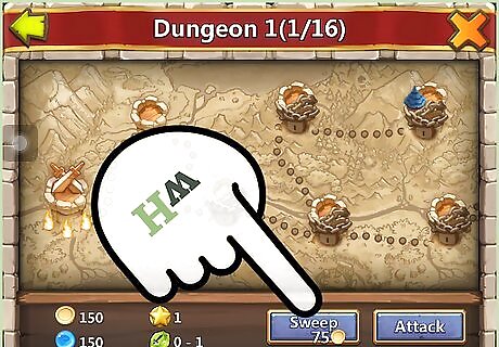 Sweep Here Be Monsters waves. Just like the dungeons, Here Be Monsters is 5 waves of monsters and heroes attacking your base. When you successfully defend the base in one of the stages, you will gain resources and other items, as well as the access to sweep the stage of 5 waves. Battle in higher stages to gain more resources and EXP. Sweep ones you have already done to get EXP and resources quicker. Use Here Be Monsters cards to gain more chances to sweep stages. This will allow you to gain EXP and resources faster.