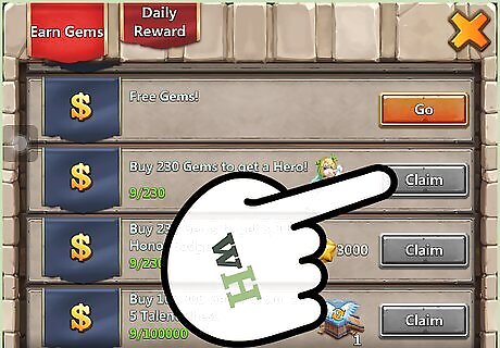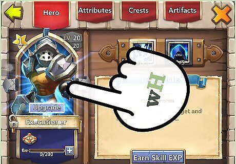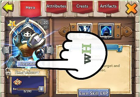 Complete quests. Claim rewards once you've completed them, and try saving your gems. These rewards include tomes, which can be used to level your hero up. The best tome that is easiest to get is Tome 3, which provides 20,000 EXP for a hero. Quests also reward shards. Shards can be used in other ways to improve your heroes.