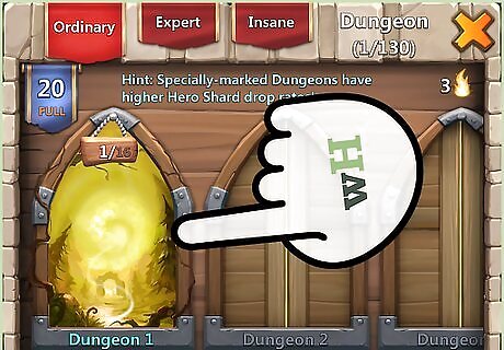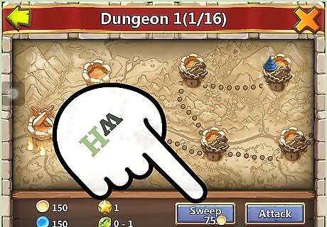 Fight in dungeons. Sweep the highest dungeons you have already done before or do a dungeon you never did before, gaining more EXP faster and easily as well. Make sure you can actually defeat the base. Consider sweeping dungeons instead. After the Castle Clash update, 25 more dungeon chances were added, meaning 30 sweeps would give more EXP then just 5 chances to gain EXP. At the same time, this would allow you some extra chances to do some higher dungeons manually. Battle in boss battles. At the last stage of every expert dungeon, a boss is on the battlefield as well. Fight in these dungeon stages as they usually give the most EXP. Take out all your heroes on the hero bases except the one(s) that you want to level up. This will cause all the EXP gained to go to that one or those hero(es). Use dungeon cards. This will give you another 5 chances in order to gain EXP faster.