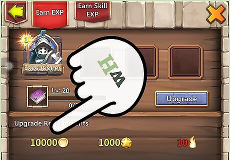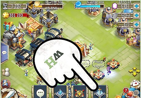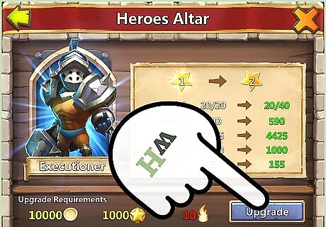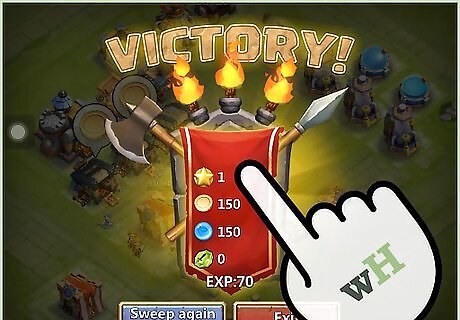 Raid others with your heroes. Every time you complete a successful raid, EXP is gained. This EXP is split between all the heroes you put on the battlefield. Use strategies to ensure a three flame victory in order to gain more EXP at a time. Place your best or your worst heroes on the battlefield, depending on if you want to make your best heroes even better, or get your worst heroes started on becoming stronger. The higher level the person is that you attack, the more EXP you will gain. Attack bases that are high level in might, but have low enough heroes and buildings for your heroes to defeat. This will also make it a sure chance that you will win three flames, and prevent your heroes from dying so that you don't have to waste gems or time trying to revive them.