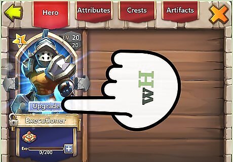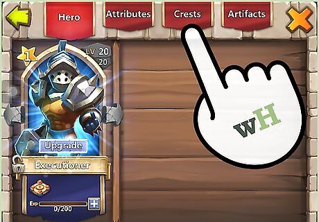 Inscribe your hero using blue crystals, and mana. Raid constantly and battle in the Lost Realm to collect these resources, and use them to make your hero stronger. Get your inscription to at least level 21 in order to allow your hero access to a second talent. Increase it up to level 100 in order to ensure the best strength for it. Inscribe other elite and ordinary heroes, and feed them to your legendaries. This will make your legendaries have even better skills. Inscribing your hero is always the surefire way to make it stronger in battle. Get your inscribe level to at least 21 in order to place crests in it. Crests allow your hero to have 2 talents and one ability at once. The max inscribe level is 100. Level the inscribe level as much as possible - once it's up to 100, your hero will almost seem invincible in every battle.