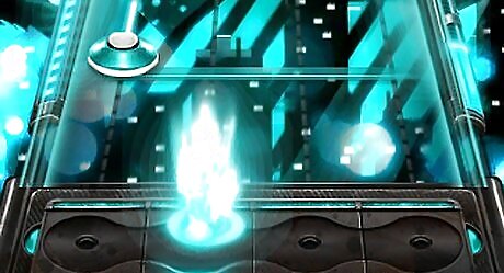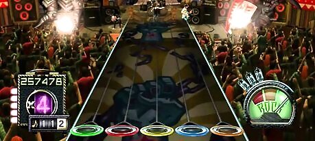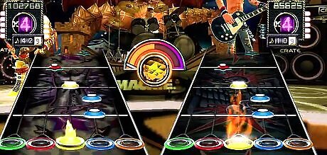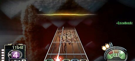 Learn to perform hammer-ons and pull-offs. In the game, they are explained in the 'advanced' tutorial. What hammer-ons and pull-offs (further in the article called "HOPOs") are are when there is a series of notes that go from the green to orange or orange to green direction you can use the strum bar once, and get all the notes. Timing when hitting the fret buttons is essential! A good way to practice your H.O.P.Os is to play "Less Talk More Rock" on Expert in the Practice section of the game, playing only the "Speedup." One more thing about HOPOs, when there is a long note, you will have to strum for the next note. You cannot strum between long notes or power chords (one or more frets at the same time) A way to make sure when it is okay to HOPO is when the "orbs" do not have a black ring on top. If there is a black ring, you must strum. NOTE: HOPOing is very hard to do in GH I.