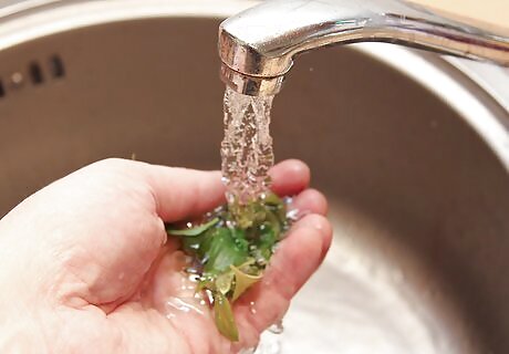 Clean the herbs. Gently wash your herbs using water. Remove any dirt, debris, and/or insects clinging to the plants. If you want less manual labor, you can encourage insects to leave the plants of their own volition by putting the freshly harvested plants in a shady place for a couple hours before cleaning them.