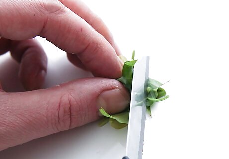Cut the herbs. Use a sharp knife to slice your herbs without bruising them. You’ll want to cut away and separate the parts (such as the roots or stems) that you don’t want to use for your infusion. Cutting herbs into small pieces will increase their surface area, which enhances their absorption in infusions. However, if you plan on storing them for a long time, you may want to keep them in the largest units possible since that will help maintain their potency.