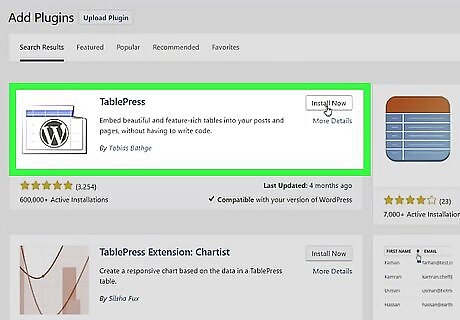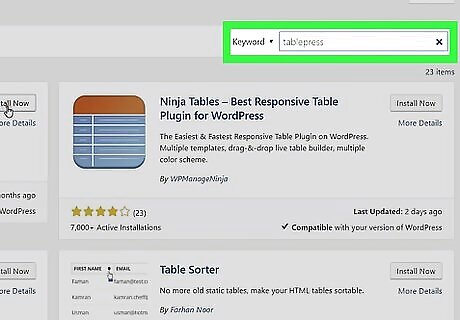 Click the Install Now button next to the TablePress plugin. Find TablePress in the search results, and click this button to install it. This will automatically install the selected plugin. After you activate the plugin, you'll find a new menu item labeled TablePress on the left sidebar. TablePress is a popular, free plugin that makes it easy to add tables in WordPress.