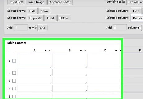 Fill out your table's rows and columns under "Table Content." Click a cell on your table here, and enter the data you want to display.