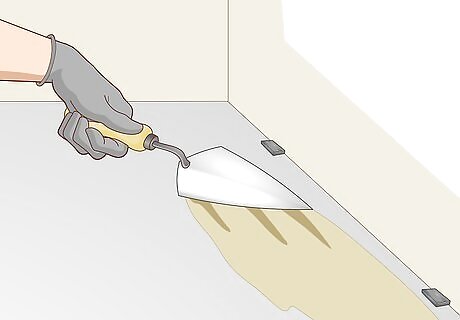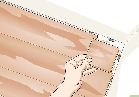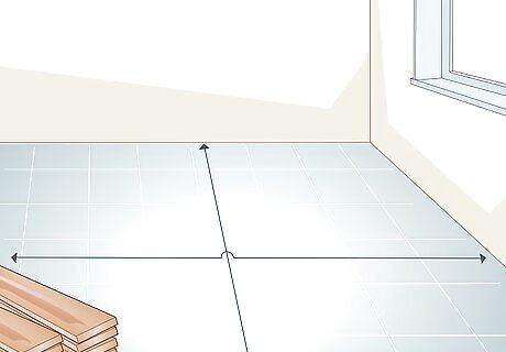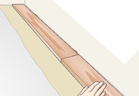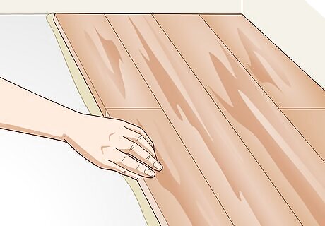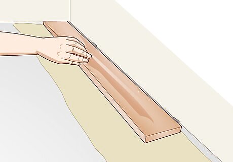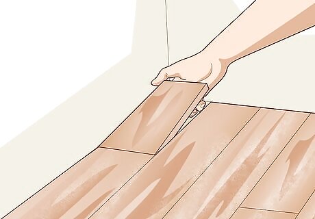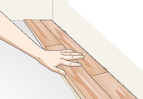 Place the longest board you have against the longest wall in the room. Take your longest, straightest board and lower it against the wall and into the floor. Press it gently against the spacers to ensure that your board is flush against the wall. Then, push directly down on the floorboard to push the glue into the subfloor and the bottom of the board.Warning: Avoid sliding your floor boards into place. If your floorboard slides on the glue, you’ll move the adhesive around and may end up uneven boards. It’s okay if you slide a board 0.25–1 in (0.64–2.54 cm) when you’re installing it against a wall, though. Don’t step on your glue while doing this. Kneel in front of the glue-filled section and reach over it to access the wall. It’s easiest to start against the longest wall in the room and build off of that. You can run the floorboards parallel or perpendicular to your longest wall. It’s completely up to you whether you want to create columns or rows. If you aren’t sure which option is best, run the boards parallel to the wall. This is the most common option. If you can do this in a corner, do that. If your corner isn’t a perfect 90-degrees though, leave a 1 ft (0.30 m) space and fill the area in later with a board you cut to size.