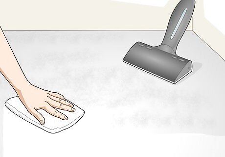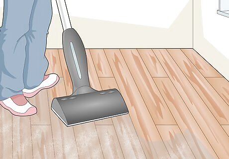 Clean your floorboards to remove any fingerprints and dust. Your bamboo flooring is likely covered in footprints and fingerprints at this point. There may also be excess dust or polyurethane residue laying on top. Use a broom, vacuum, and clean cloth to remove any marks and clean up your floor. Do not get your bamboo floorboards wet at this point. The adhesive needs a little more time to cure completely and water can interfere with this process.