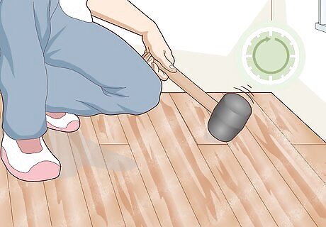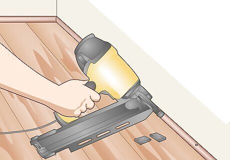 Cut unique pieces out as you work to fill in gaps. As you complete lengths of the floor, you will end up with small gaps near your walls, corners, and doorways where your precut pieces won’t fit. When you encounter these, use a measuring tape to determine how long the piece for this slot must be. Go back to your saw and cut a board to size so that it fits the slot you just measured. After cutting the board to size, return to the installation area and fit the board into the slot. This process is a lot smoother if you have someone to help you. One person can cut the pieces to size while the other person installs boards elsewhere on the floor. Do your best to lay corners down before you enclose the entire area in surrounding boards. This way, you’ll always have an angle to slide the board into the corner. For door jambs, slide boards underneath the edges instead of cutting them to size to make things easier.