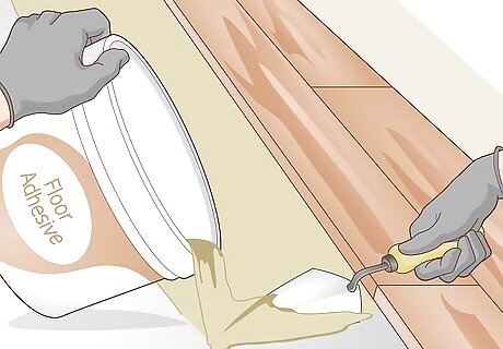 Apply glue to the area near your longest wall using a trowel. Put on a pair of thick gloves. Pour a 0.5–1 gallon (1.9–3.8 L) of floor adhesive directly on to your floor. Spread the glue out by dragging your trowel over the adhesive at a 45-degree angle while pressing it into the subfloor. Spread the adhesive out across a small rectangular section of the floor. Work in a serpentine pattern and address lumpy areas by covering every section 2-3 times. The glue should be evenly spread out across the section that you’re working. There should be no obvious pools of glue and every section should have the parallel marks from the teeth of your trowel. You’re going to work in small sections by pouring glue, spreading it out, and adding your boards. The size of your sections is entirely up to you. Working in 2–3 by 8 feet (0.61–0.91 by 2.44 m) sections is a good average working pace. Do not step in the glue and keep your sections thin enough that you can reach over them while kneeling.
