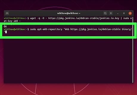 Add "deb https://pkg.jenkins.io/debian binary/". This will now add the official Jenkins repository to your system. The full command should look like sudo apt-add-repository "deb https://pkg.jenkins.io/debian binary/" If you're going for the stable version with the stable key from the beginning, use "deb https://pkg.jenkins.io/debian-stable binary/" instead. Press ↵ Enter or ⏎ Return to run the full command.