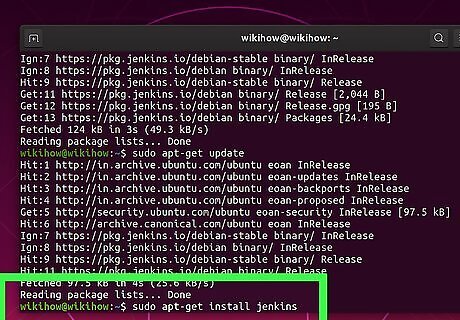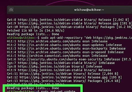 Type and run sudo apt-get install jenkins. This command will install Jenkins from the official repository. If you're prompted to install extra packages, type Y and press ↵ Enter to proceed.