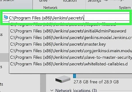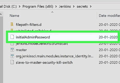 Copy the folder directory address from the "Unlock Jenkins" page. You'll find the folder directory for your Jenkins install location written in red Unicode characters. Select and copy the address here. This address is often C:\Program Files (x86)\Jenkins\secrets\initialAdminPassword or a similar directory depending on your configurations.