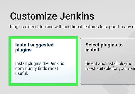Click the Install suggested plugins box. This option will install the most popular, useful, and crucial Jenkins plugins on your computer. Alternatively, you can click Select plugins to install, and manually select which plugins you want. You can track the plugin install on a blue progress bar. When your install is finished, you'll be prompted to create your first admin user for your Jenkins system.