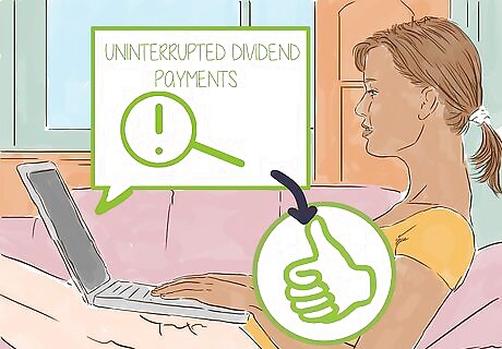 Compile a list of candidate stocks. There are thousands of stocks on the market, but not all are suitable for dividend investors. There are several ways to narrow your search for top-quality dividend stocks: Research the 30 stocks from the Dow Jones Industrial Average (DJIA). These are large American companies that are leaders in their respective industries. Many of them have the high-quality characteristics required for long-term performance, but some may not. This list is important, because it is a widely used benchmark for the U.S. stock market. Evaluate each company on the list in light of the criteria discussed in later steps. Use an online stock screener such as eSignal to screen for stocks with a market cap of at least 100 million dollars and a dividend yield of at least 150% of the Standard & Poor's 500 average yield. (If the S&P 500 averages a 2% dividend yield, look for stocks with at least a 3% dividend yield). Search also for stocks with a five-year average return-on-equity of at least 15%, a long-term debt-to-equity ratio of less than 1, interest coverage of at least 5% (see note in the Warnings section), and a 10-year earnings-per-share (EPS) growth of 5% or more. This should narrow down the list of candidate stocks considerably. In fact, most stocks found by an online stock screener will fail to satisfy this list of criteria in full and thus will not qualify as high-quality dividend stocks. Additional research is necessary, as outlined in later steps. Look at the list of holdings of mutual funds that invest primarily in high-quality dividend stocks, such as (among many others) the Vanguard Dividend Appreciation Fund. Such a list contains good suggestions for finding high-quality dividend stocks. Find a list of dividend achievers, those stocks with a history of raising dividends over time. Look for such a list in the financial press, on financial websites, or from certified financial advisors. Look at the list of dividend aristocrats: stocks that have consistently increased dividends every year for at least 25 years. You can find the most updated list by doing an internet search. This list of blue chip stocks consists of top-quality dividend stocks that meet the criteria mentioned here.