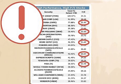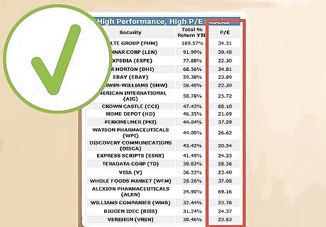 Rank the list of investable stocks. Calculate or look up P/E (price-to-earnings) ratios and then rank them from lowest to highest. Calculate these ratios using average earnings over the past three years in order to minimize the effect of any unusual earnings periods (containing large but non-recurring expenses or income). Also calculate price-to-book (P/B) ratios and price-to-sales (P/S) ratios. The lower these are, the better. To calculate a price to earnings ratio, divide the current stock price by earnings per share (found on the balance sheet. To calculate price-to-book ratios, divide the current stock price by total assets minus intangible assets and liabilities. (from the balance sheet To calculate price to sales ratio, divide the current stock price by sales per share for a 12 month period. Find the sales amount on the income statement and the number of shares on the balance sheet.