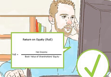 Look for high return-on-equity. A five-year average of 15% should be the minimum, and 20% or more is preferred. To calculate return-on-equity, divide net income (from the income statement) by shareholders' equity which is assets minus liabilities (from the balance sheet).