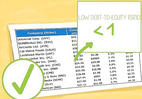 Analyze financial strength. There are several key measurements that will help indicate a high quality stock. Look at the balance sheet and income statement for the following key measurements of financial strength: Low debt-to-equity ratio. It should be less than 1. To calculate, look on the balance sheet and divide total liabilities by total shareholders' equity. Some companies with low or medium levels of debt can still be good investments. Key is their ability to pay debt comfortably. The debt can also be used to leverage returns to shareholders. High interest coverage (net interest earnings that are at least five times interest expense, found on the annual income statement). No shares of preferred stock listed on the balance sheet. Preferred stock can be more costly to the issuing company than are bonds. However, this depends on the terms of the preferred stock issuance. A convertible, non-participating preferred stock issue could have a lower cost than debt. Ideally, total current assets should exceed total current liabilities. (Look on the balance sheet.) This can give you confidence that the company will not run into any immediate cash-flow problems. A current ratio (total current assets/total current liabilities) greater than 2 is desirable but not mandatory.