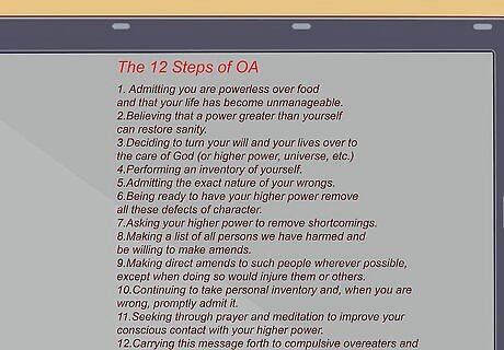 Research how the program works. The basic underlying process of Overeaters Anonymous focuses on the 12 steps that are very similar to Alcoholics Anonymous and other addiction groups. The twelve steps include: Admitting you are powerless over food and that your life has become unmanageable Believing that a power greater than yourself can restore sanity Deciding to turn your will and your lives over to the care of God (or higher power, universe, etc.) Performing an inventory of yourself Admitting the exact nature of your wrongs Being ready to have your higher power remove all these defects of character Asking your higher power to remove shortcomings Making a list of all persons we have harmed and be willing to make amends Making direct amends to such people wherever possible, except when doing so would injure them or others Continuing to take personal inventory and, when you are wrong, promptly admit it Seeking through prayer and meditation to improve your conscious contact with your higher power Carrying this message forth to compulsive overeaters and practicing these principles in all your affairs