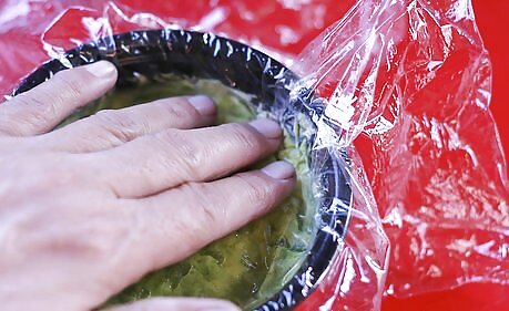 Smooth a sheet of plastic wrap over the guacamole. Place a sheet of plastic wrap over the bowl. Using your fingers, smooth the plastic down until it is pressing against the entire surface of the guacamole. The plastic wrap will create a sort of seal between the air and the guacamole.
