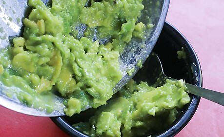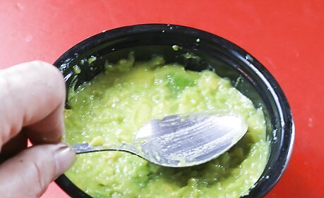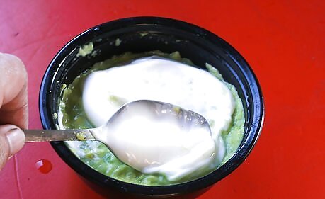 Smooth out the surface of the guacamole with a spoon, making it as flat as possible. This will make it easier to spread the sour cream on top—and scrape the sour cream off later.