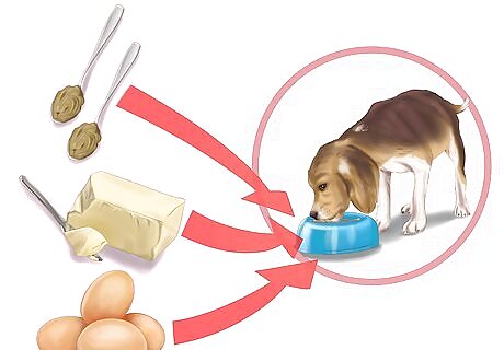 Add additional fat to food. Another way to help your pet gain weight is to supplement your pet’s diet with tasty and easily handled food. This can include a scrambled egg cooked in butter, a teaspoon or two of peanut butter, or a teaspoon of cooking oil to her food. These foods can be added to the food once a day at first. If you have a larger dog, you can add these to the food two or three times a day.