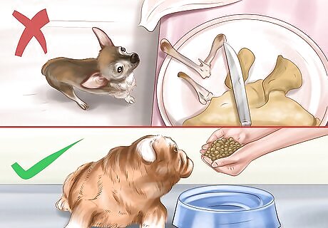 Change the way you feed your pet. One of the main reasons that pets become obese is that they eat too much. Feed your pet the recommend amount of food daily as recommended by your veterinarian. If you feed your pet twice a day or more, split the recommended amount of food between the feedings. Use a measuring cup to actually measure out the exact amount of food. Don’t feed your pet table scraps. Your dog or cat needs fewer calories than you expect. Feeding pets from the table or feeding leftovers can unbalance a pets' diet quickly. Most human food is typically too high in fats, salts, and sugars for pets. Talk to your vet about cutting down on how much you feed your pet. Some vets suggest cutting the amount of food your pet gets every day by a third from where she starts. This will reduce her food intake and should help you lose weight.