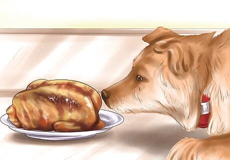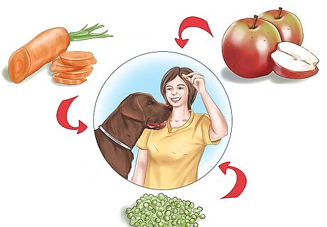 Limit treats for dogs. If you feed your dog treats, be sure to include this as part of the diet daily calories. Feeding treats can be overdone. Feed low calorie healthy treats to your pet, either commercially prepared dog treats, carrots, apple slices, or green beans. Also try saving some of your dog's dry food and give it as treats. If your dog likes carrots, frozen peas, apples, or other vegetables, give these as low fat, high fiber treats. Instead of handling a treat to your healthy dog, toss it a distance from you so the dog is encouraged to trot across the room or down the hall to get the treat. Add a phrase like "go far" as you toss the treat. Most dogs will soon learn to start the walk as you say the command and getting treats will become additional exercise. You can also start rewarding your pet with play or a training session instead of a treat. If you have a cat, limit the amount of treats you feed her as well. Alternate treats that are healthier can be lean chicken or tuna. Try breaking a big treat into smaller pieces instead of giving it to your dog all at once.